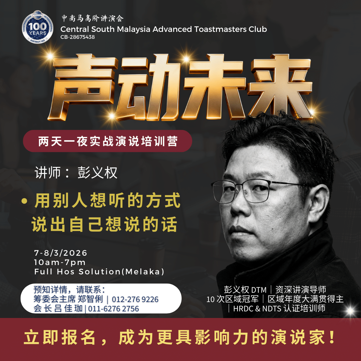 🔥 你的声音,为什么总是“差一口气”?🔥 你有没有这种感觉—— 明明准备得很充分,一站上台,气场就是出不来。 台下的人点头,但你知道,他们没有“被电到”。 你讲的都对,但少了那一点—— 让人听完想行动的力量。 不是你不够好。 是你的方法,没把你真正的实力“逼”出来。 🎤 两天一夜|不只是学会,而是“练到会” 这不是又一个教你“理论”的课。 这是一个让你“亲身上台、被指导、再上台、直到过关”的训练营。 你缺的不是知识。 是一个能立刻给你反馈、帮你修正、逼你突破的环境。 👑 三位讲师,三种实战心法 彭义权 DTM|20年讲演实战,专治“讲得很顺,但没记忆点” 萧晓凤|用情绪穿透听众,让你的话进到人心里 锺冠翔|AI工具+表达逻辑,把效率提升3倍 📌 两天,你会带走什么? ✅ 一套“听众想听”的表达结构 ——不是你说得爽,是他们听得进、记得住 ✅ 3个立即提升说服力的逻辑框架 ——内容不变,换种说法,影响力翻倍 ✅ AI工具实战演练 ——风格由你定义 ✅ 7个月会员籍 ——训练营只是起点,持续练才是关键 🎯 这不是给“想学演说”的人。 这是给“想把影响力变现”的人。 📅 07-08.03.2026 📍 Melaka(住宿没问题) ⏳ 早鸟 RM350 只到 22.02 之后恢复 RM398 报名截止 01.03 📞 不是想清楚才报。 是报了,才会真正想清楚。 郑智俐 012-276 9226 吕佳珈 011-6276 2756 🎤 声动未来 你的声音, 不该只是被听见。 而是—— 你一开口,世界就得停一下。
