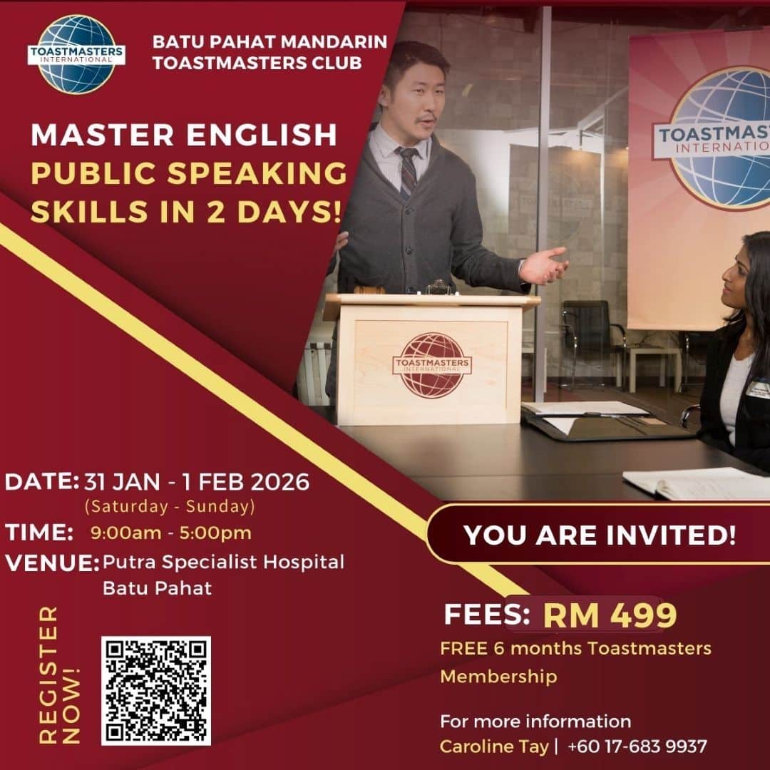 📅 31 Jan – 1 Feb 2026 (Saturday & Sunday) ⏰ 9:00 am – 5:00 pm 📍 Putra Specialist Hospital, Batu Pahat ⚠️ Register by Monday 26 Jan 2026 (Limited seats!) 👉🏻 https://docs.google.com/forms/d/1i-oENiMGqGR7bFIejhptiEU0UDF3x6vjoVTpNN11WEA/edit 𝗪𝗵𝗮𝘁 𝘆𝗼𝘂’𝗹𝗹 𝗹𝗲𝗮𝗿𝗻 & 𝗲𝘅𝗽𝗲𝗿𝗶𝗲𝗻𝗰𝗲: 🧍♂️ Confident body language that supports your message 🎙️ Vocal variety & tonality to inject emotion and impact 🧠 How to structure a clear and compelling presentation ✍️ Effective use of words to connect with your audience ⚡ Master impromptu speaking with confidence 📖 Powerful storytelling techniques ✅ Immediate, constructive feedback to accelerate improvement 🎁 𝗪𝗵𝗮𝘁’𝘀 𝗶𝗻𝗰𝗹𝘂𝗱𝗲𝗱: 🇺🇸 US-based curriculum with over 102 years of time-tested materials 👥 Small-group guidance from experienced mentors 🍽️ Meals & refreshments provided 📜 Certificate of completion 🌍 Added value through Toastmasters learning & exposure 📞 Enquiries: Caroline Tay | 017 683 9937