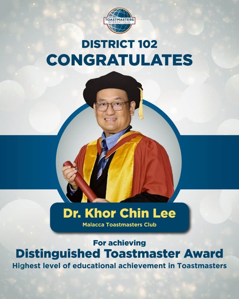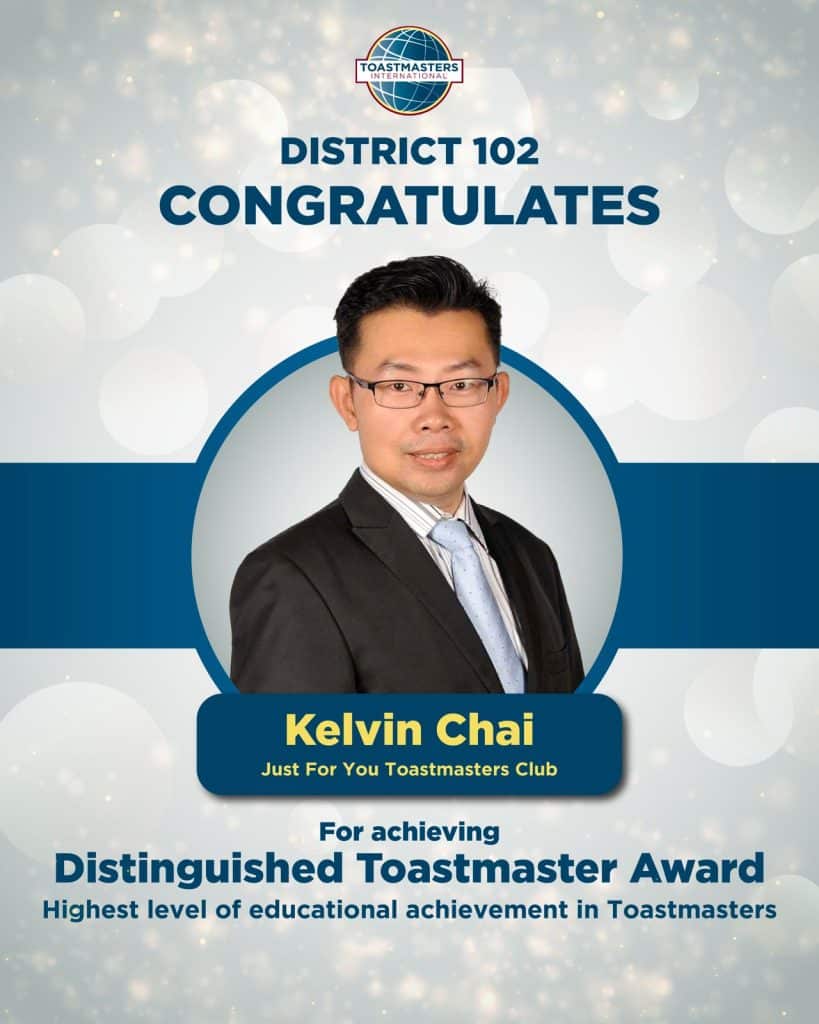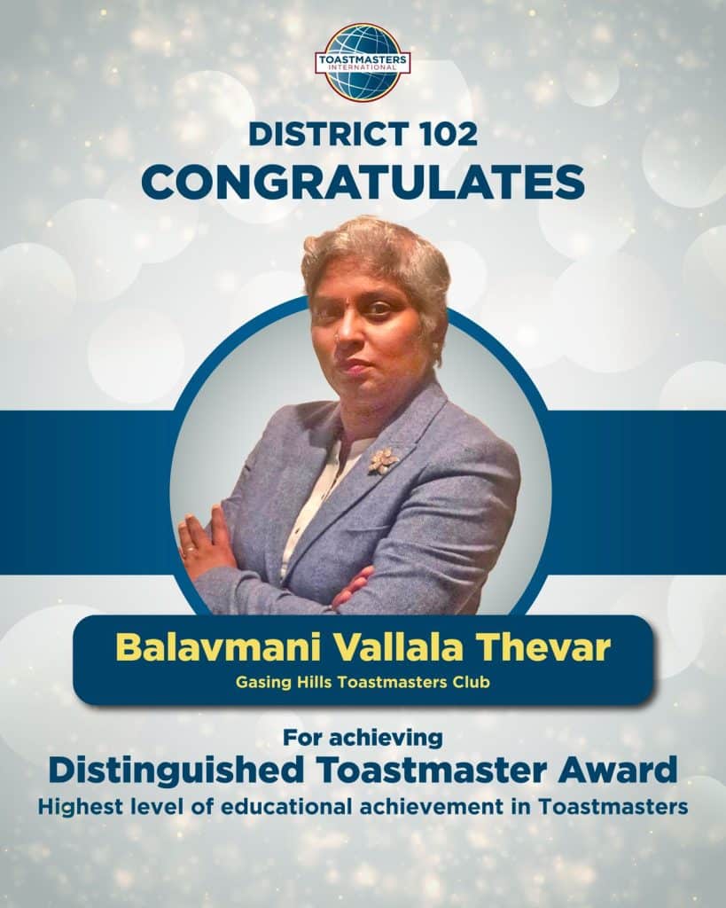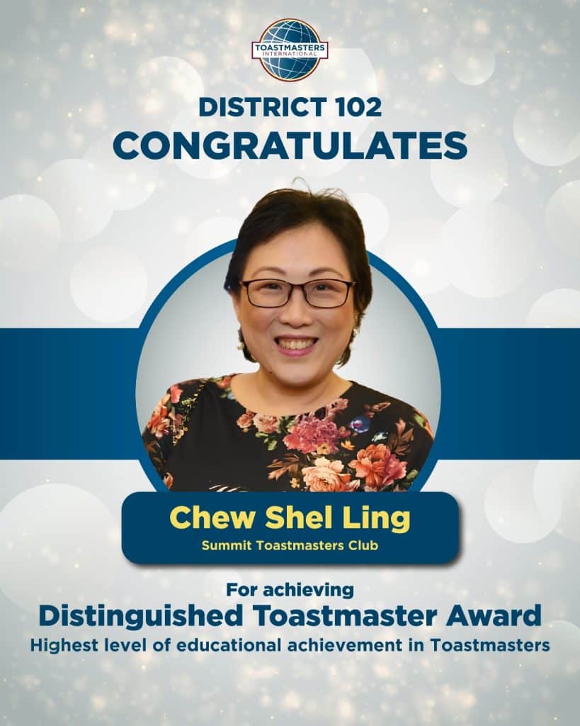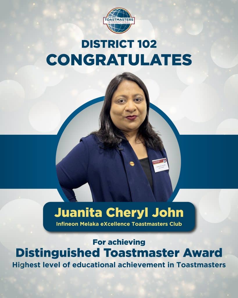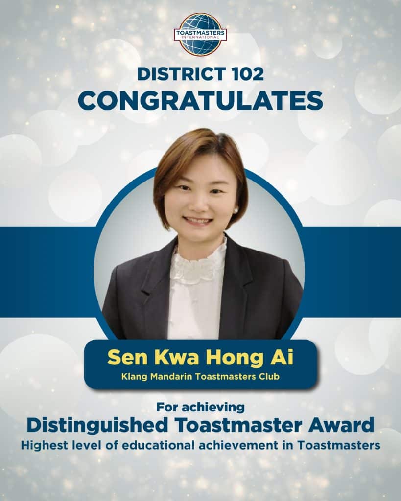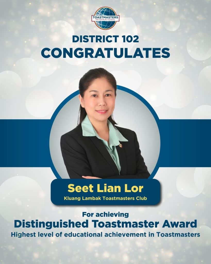 District 102 proudly celebrates the following members on achieving the Distinguished Toastmaster (DTM) Award – the highest level of educational achievement in Toastmasters. Your dedication, perseverance and leadership serve as an inspiration to all Toastmasters. Well done on reaching this remarkable milestone!